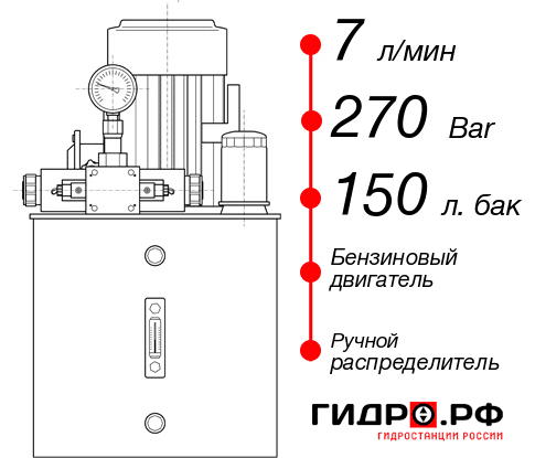 Гидростанция НБР-7И2715Т с гидравлическим контуром 7 л/м и давлением 270 bar. В конструкции используется бензиновый двигатель и масляный бак на 150 литров. Цена с доставкой до производства в Великом Новгороде 180525 руб. Рекомендуемая комплетация: манометр электроконтактный, индикатор расхода, гидравлический замок с гидроуправлением.
